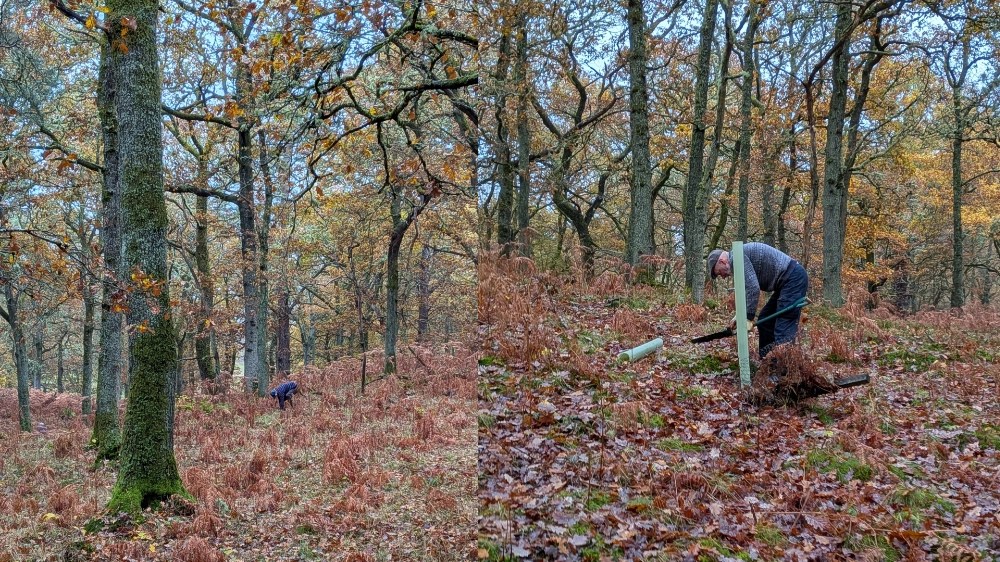 Continuing the planting from last weekend, seven volunteers selected and protected more than 40 small oak trees that had grown from last years acorns (prospects). We chose the ones that had the best access to light beween the canopy of the mature oaks above.